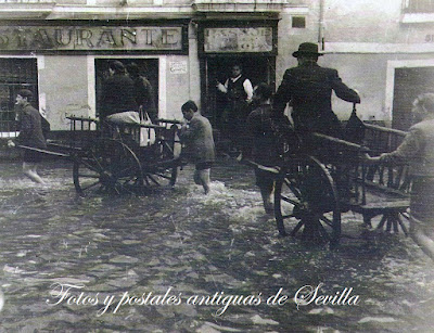 Don Alfonso XIII (el primero a la derecha, dentro de la barca) recorriendo el paseo de las Delicias, donde las aguas alcanzaron gran altura. 1912. "El Imparcial" 7 de Febrero 1912.- Todos los barrios bajos de la ciudad están inundados y ante el temor de que las aguas suban más o las viviendas se derrumben, sus moradores se han trasladado al centro de la ciudad. El alcalde y los tenientes alcaldes repartieron más de 3000 panes por los barrios inundados, para ello se valieron de lanchas. En muchas calles de Triana el agua alcanza 2 metros de altura y en la Alameda, calle Trajano, barrios de la Feria más de un metros. La dehesa de Tablada es una laguna y desde las huertas de la Macarena piden frecuentemente auxilio izando banderas negras y disparando tiros.