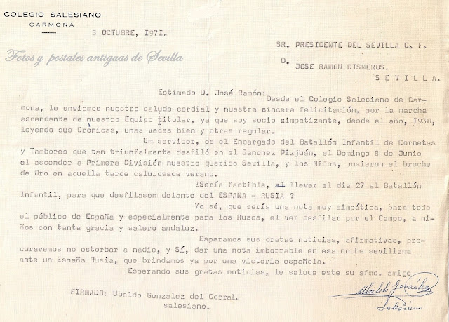 Un año antes del partido España-URSS, el presidente de la R. F. E. F. envía un "Saluda" donde ya se puede leer el interés que había, para que éste se celebrase en Sevilla. Este documento se envió a todos los Alcaldes de los 106 pueblos de Sevilla, acompañado de 2 entradas de banco de pista.